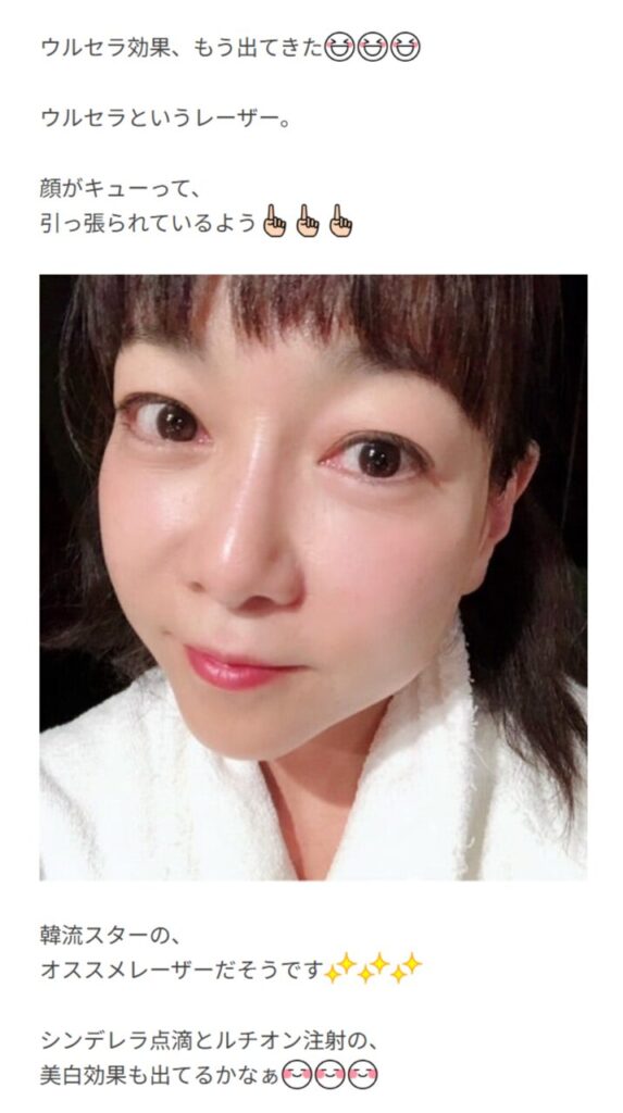 過去に、自身のブログで韓国で「ウルセラ」という超音波によるリフトアップ治療を受けたという情報がありました。ウルセラの特徴は額や眉、まぶたのたるみに効果的で、切らない施術のため長期間のダウンタイムが無いそうです。また、「シンデレラ点滴」や「ルチオン注射」などの美容関連の点滴・注射を受けたという記述もあります。