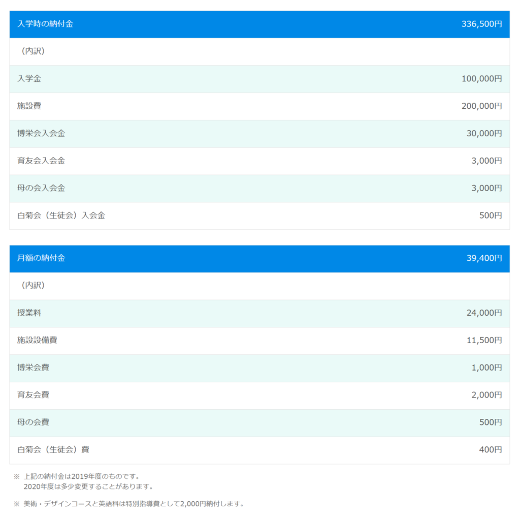 飯田栞月さんは千葉県にある「国府台女子学院」に小学校から高校まで通っていました。この学校は私立の女子校で、1カ月の学費が2019年度で39,400円です。これ以外に高等部入学時の納付金として336,500円もあります。