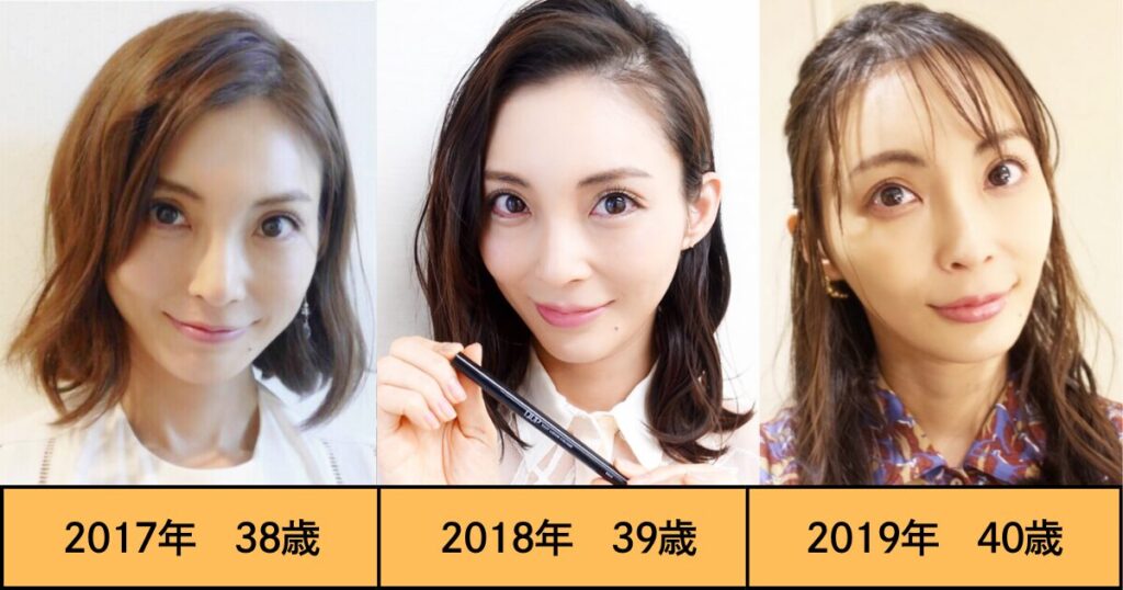 日下志先生:お二人とも文句なしに美しいですが……まず、押切さんはとても痩せた! ダイエットしたのか、エラ部分を細くするために「ボトックス注射」をされたのかわかりませんが、顔がとても痩せましたね。お二人とも身体は若いころからかなりスリムでしたが。しかし、押切さんは顔が痩せたことで目の上も痩せて、30代後半には窪み目になった印象です。そのせいか、二重の幅が目立つようになりましたね。鼻筋もシュッとしたような?
