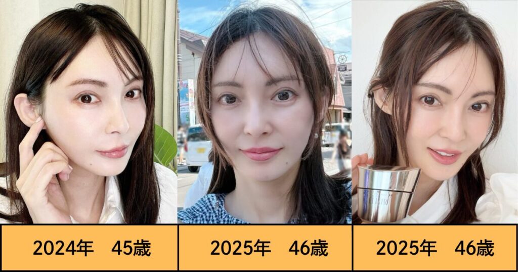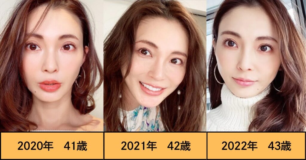 1979年生まれの押切もえさんは現在40代半ばです。年齢を重ねることで、誰にでも起こる自然な変化があります。目の周りのしわの増加、頬や顎の肉の減少、肌のハリや弾力の低下、顔全体のたるみなどが見られます。