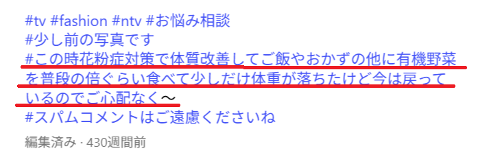 2017年に激やせが話題となった際、押切もえさんは自身のInstagramで次のように説明しました。「花粉症対策で体質改善してご飯やおかずの他に有機野菜を普段の倍ぐらい食べて少しだけ体重が落ちた」と述べています。