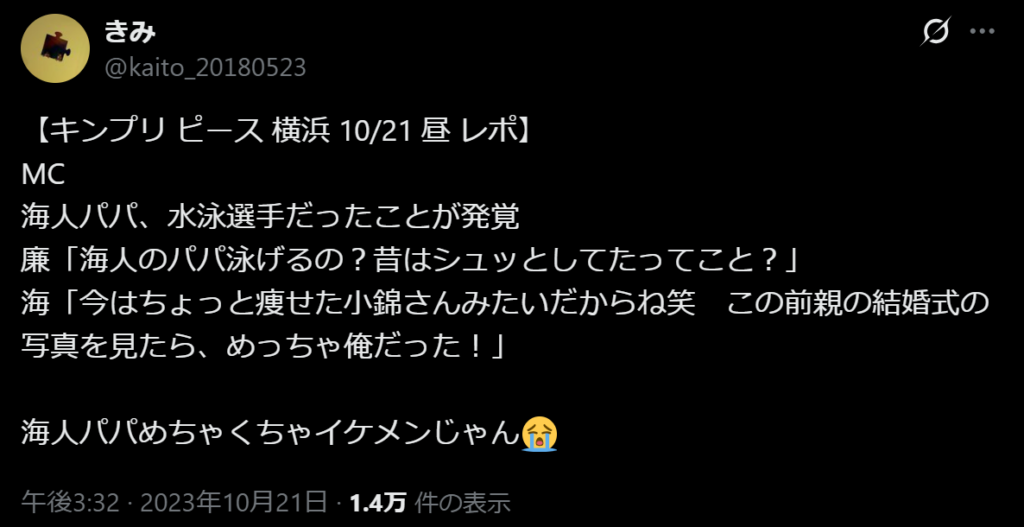 また、父親の厳しさと優しさのバランスが取れた教育方針が、髙橋さんの人格形成に大きな影響を与えたと言われています。さらに髙橋さん自身も父親とのエピソードを話すことが多くファンからも「海パパに会いたい!」というコメントがSNSには沢山あり、髙橋さん同様に愛されキャラになっています。