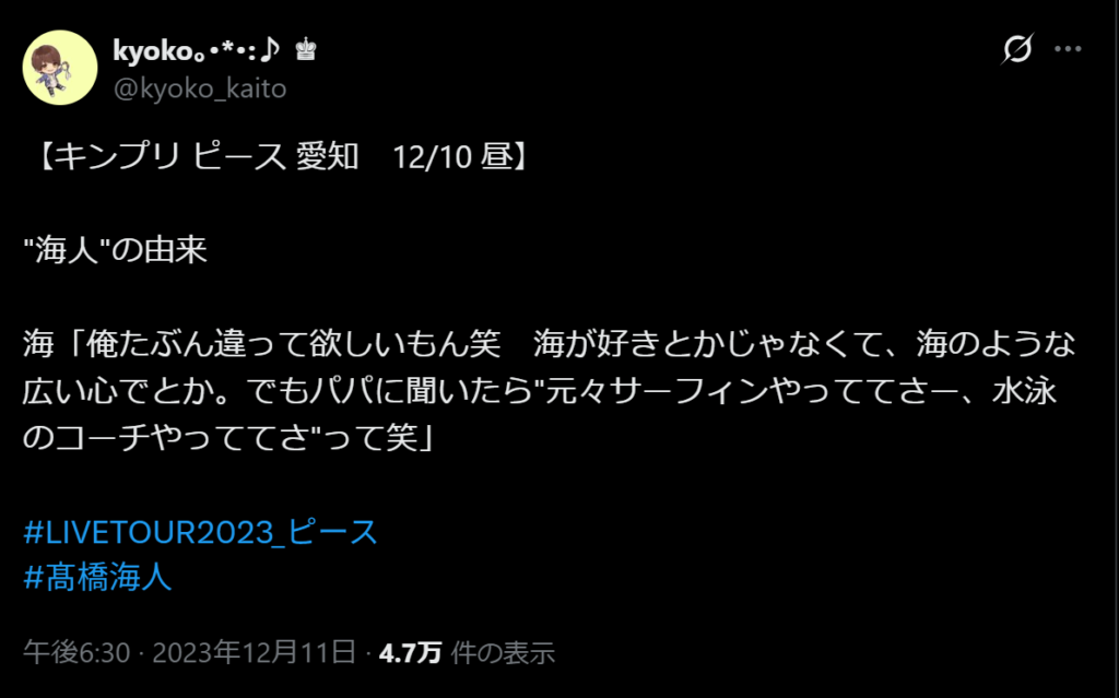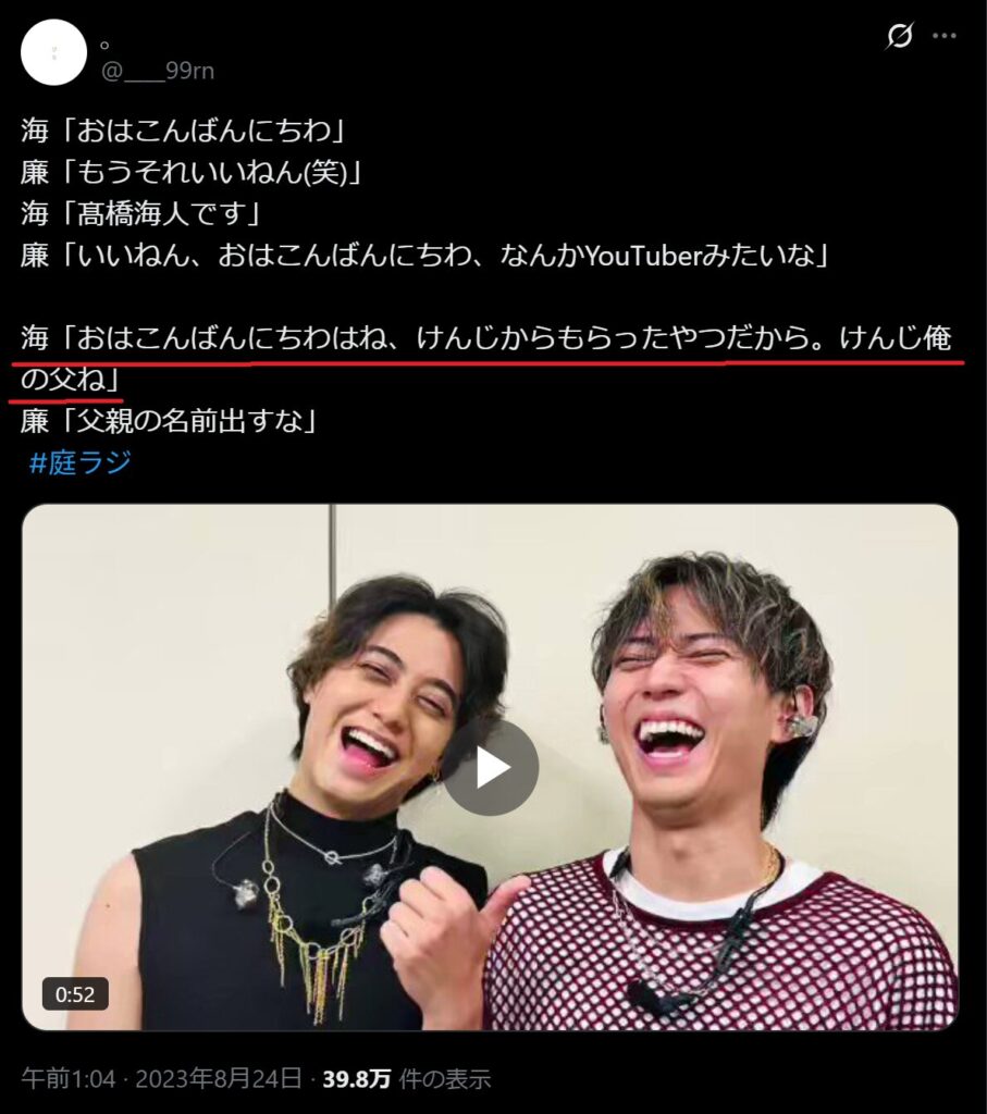 髙橋海人さんの名前ですが「けんじ」さんと言うそうです。髙橋さんがラジオでの発言がXで投稿をされています。