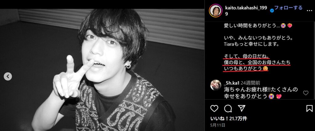髙橋海人さんと母親の関係は非常に親密で、「ママ」と呼んでいるましたが、何かのタイミングで「母」と呼んでいることにファンが気づき悲しがる位というエピソードがあります。
