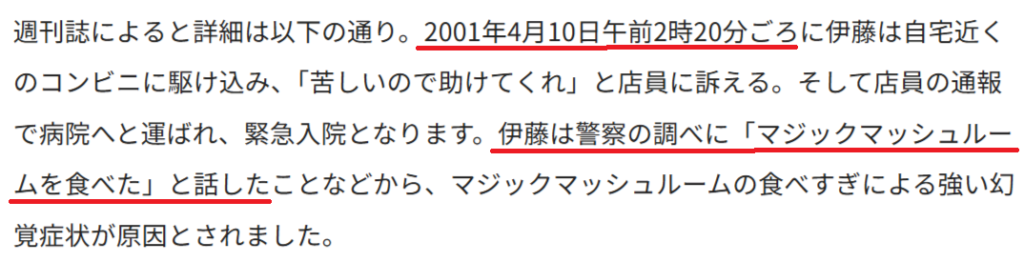 2001年の事件は、実は逮捕ではなく救急搬送だったのです。当時、マジックマッシュルームは規制対象外で、伊藤さんは法的には処罰の対象にはなりませんでした。しかし、この事実が誤って伝わり、逮捕疑惑につながったようです。